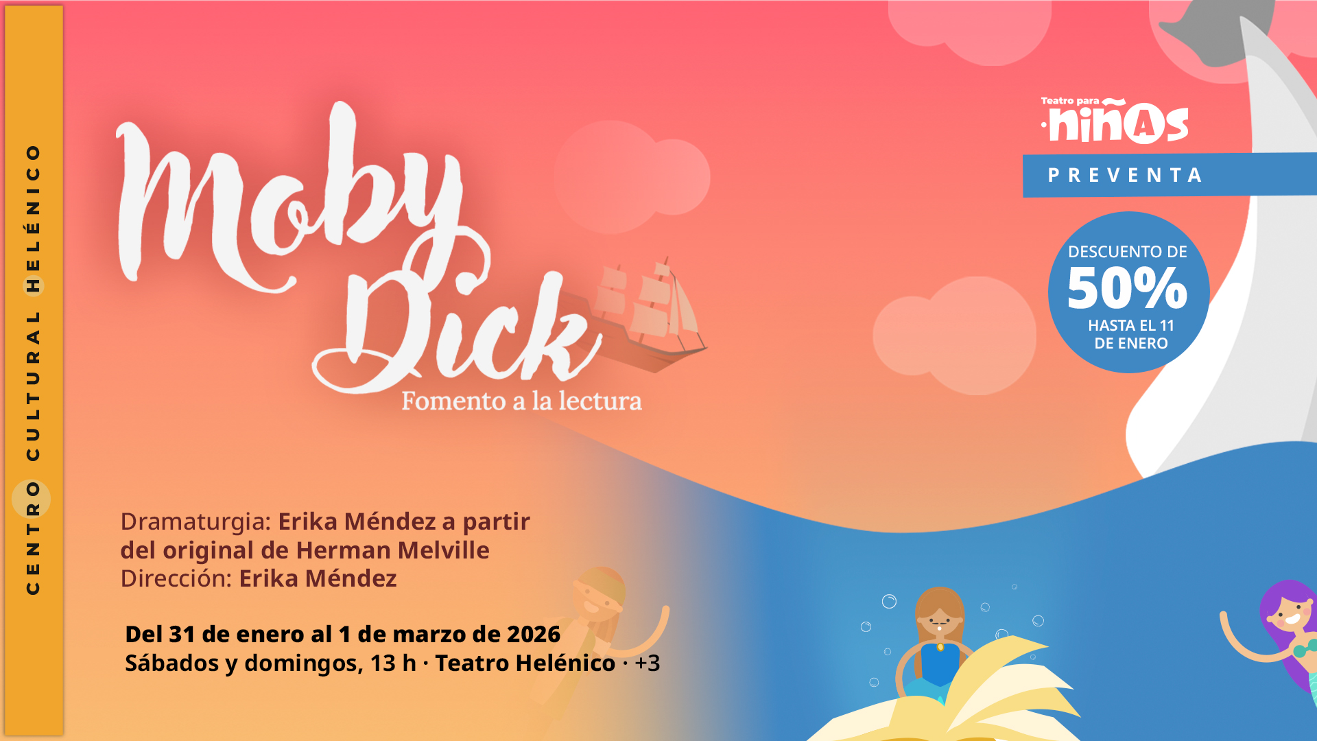 SinopsisJosé Pérez es un hombre común que, en busca de nuevas emociones, llega al Teatro Helénico para presenciar la obra Moby Dick. En escena, una niña le muestra que, a través de la lectura, es posible acceder a historias extraordinarias. Al abrir un libro, ambos desencadenan una experiencia mágica: los personajes aparecen frente a él y José se convierte en protagonista de las aventuras narradas. Mediante danza, teatro, comedia y títeres, el escenario se transforma en un paisaje marítimo donde se viven emocionantes travesías con ballenas gigantes, barcos y batallas entre olas inmensas.