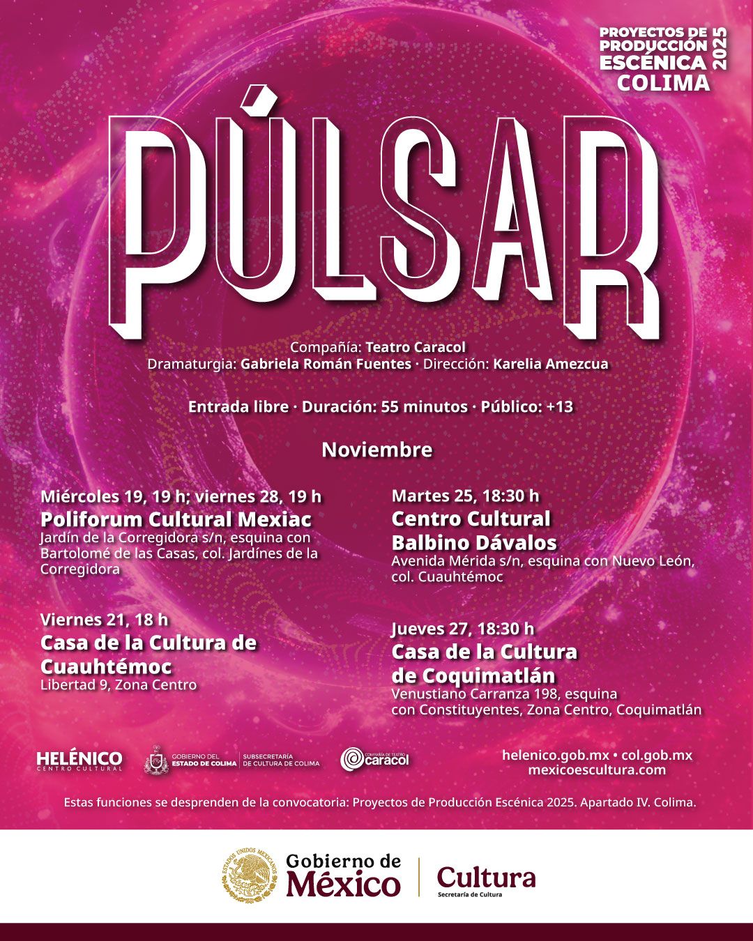 Estas funciones se desprenden de la convocatoria: Proyectos de Producción Escénica 2025. Apartado IV. Colima.