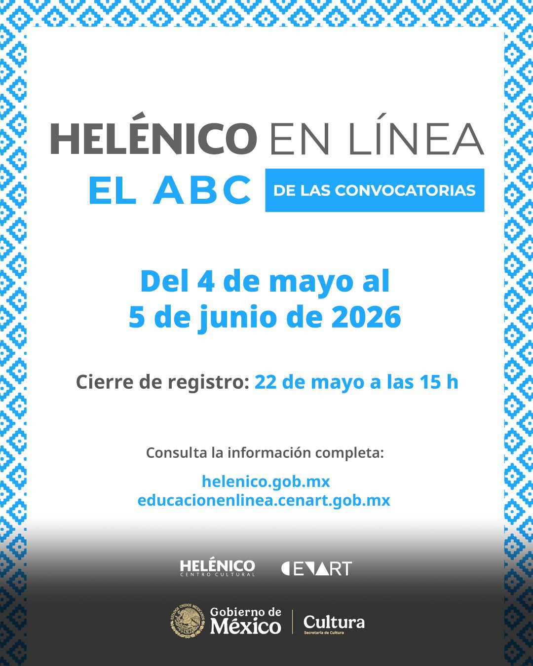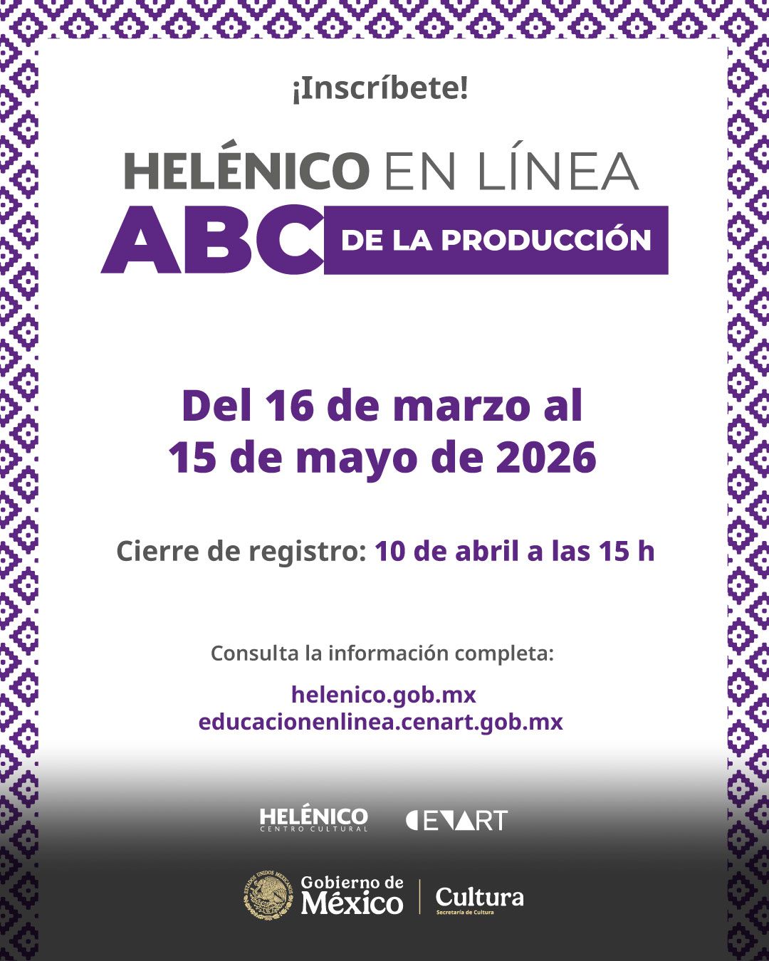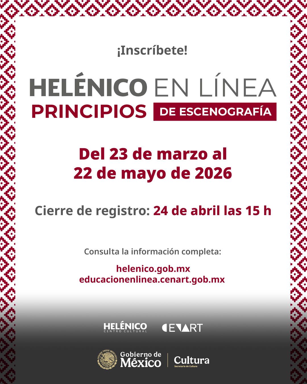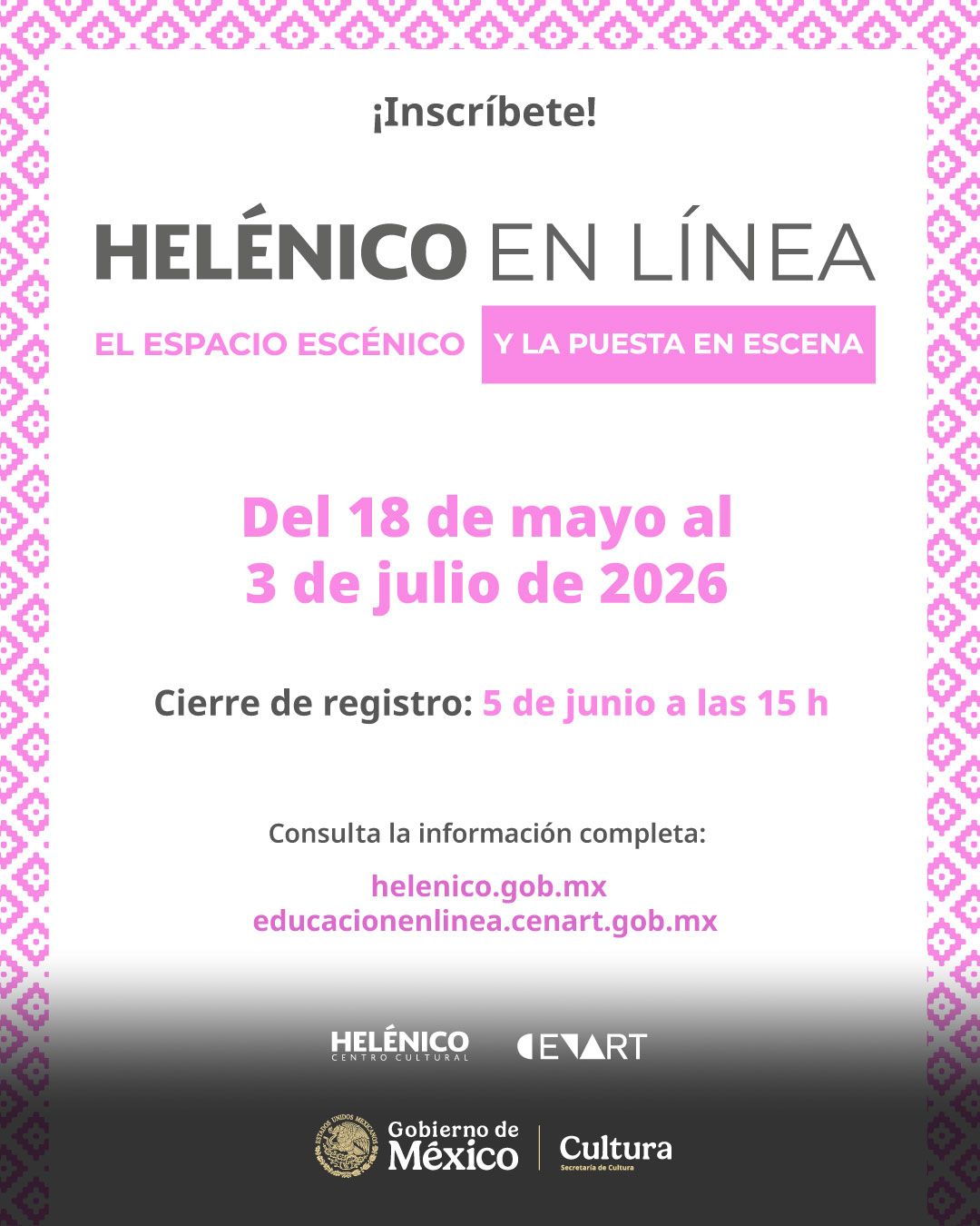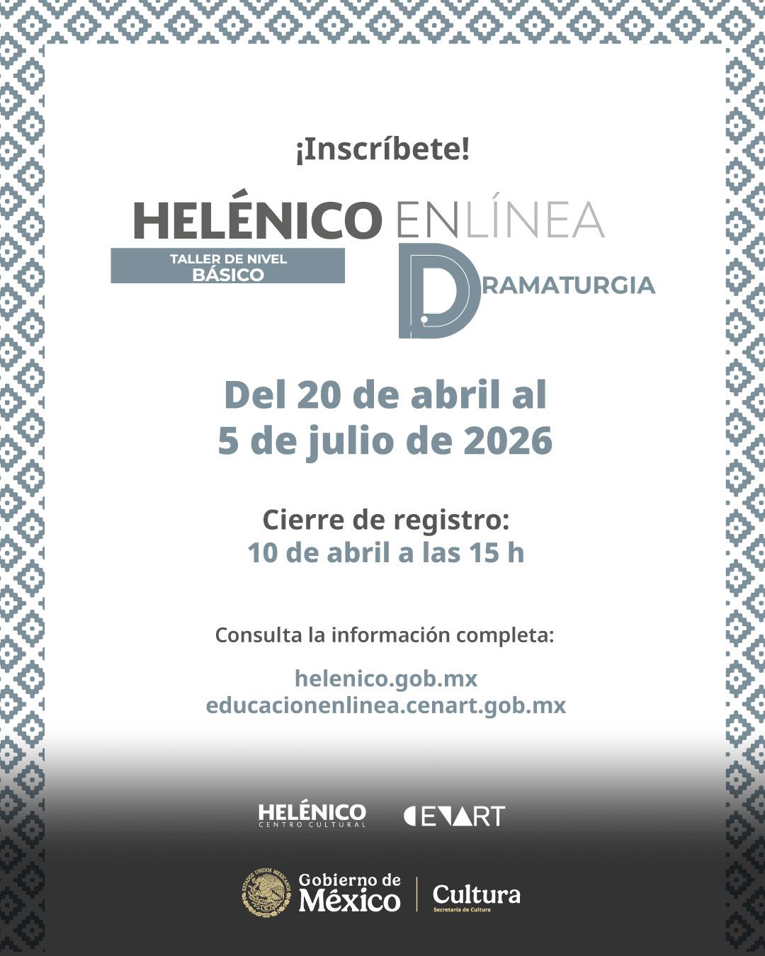 La Secretaría de Cultura, a través del Centro Cultural Helénico y en colaboración con el Centro Nacional de las Artes, convoca a personas gestoras, productoras, escritoras, académicas, creadoras escénicas de todo el país, estudiantes de teatro y público en general, con interés en profesionalizarse en línea sobre temáticas clave de la escena en las áreas de: dramaturgia, dirección, producción y creación escénica, en sus modalidades de taller y curso Massive Online Open Courses (MOOC).